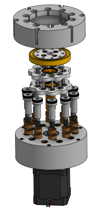 After completing a prototype manual design, it was time to design a version that connected to my Nema 17 stepper motor. The cycloidal discs were similar, but I needed a design that minimized friction, maximized rigidity, and still managed to be compact and cheap. After a few iterations, I landed at the following design: