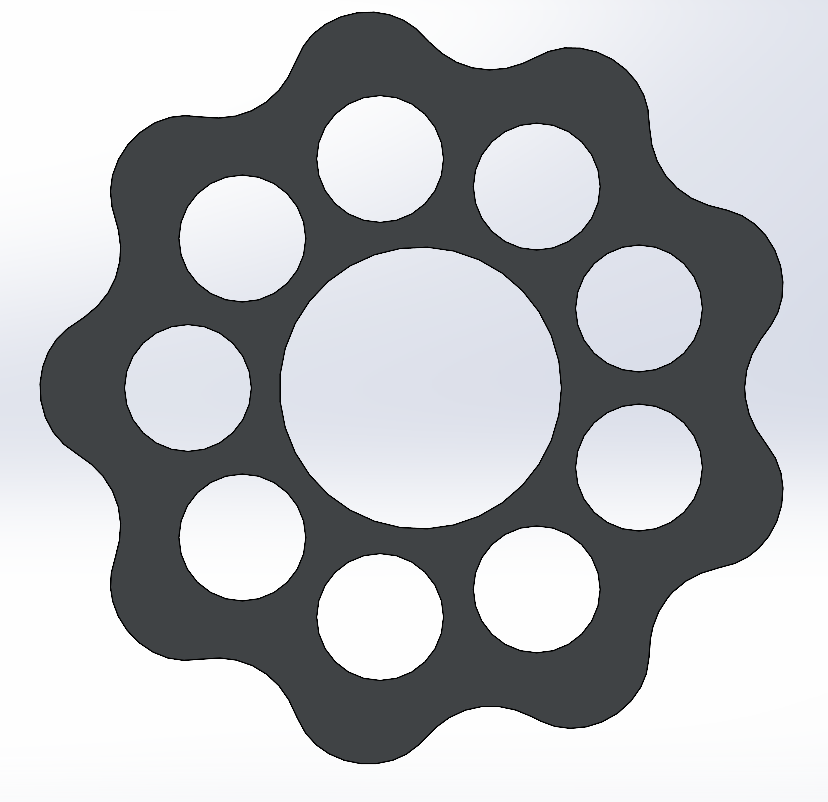 This disk profile was generated using epitrochoid parametric equations along with the following parameters: 45mm pitch diameter, 10mm roller diameter, N = 10 (10 rollers), and 2mm eccentricity. Next, I made holes for the input shaft and the output pins. I also designed another version of the disk, where the holes were 180 degrees out of phase for alignment purposes.