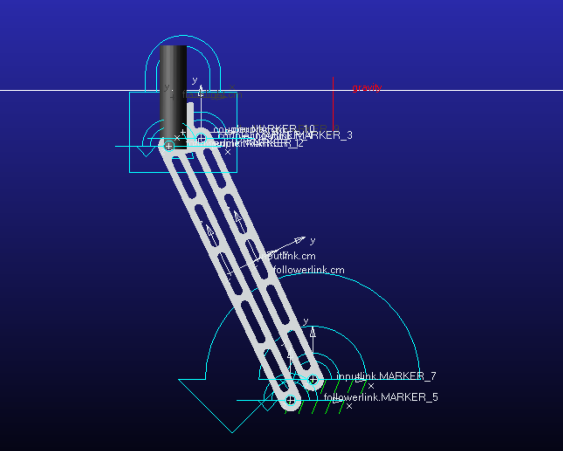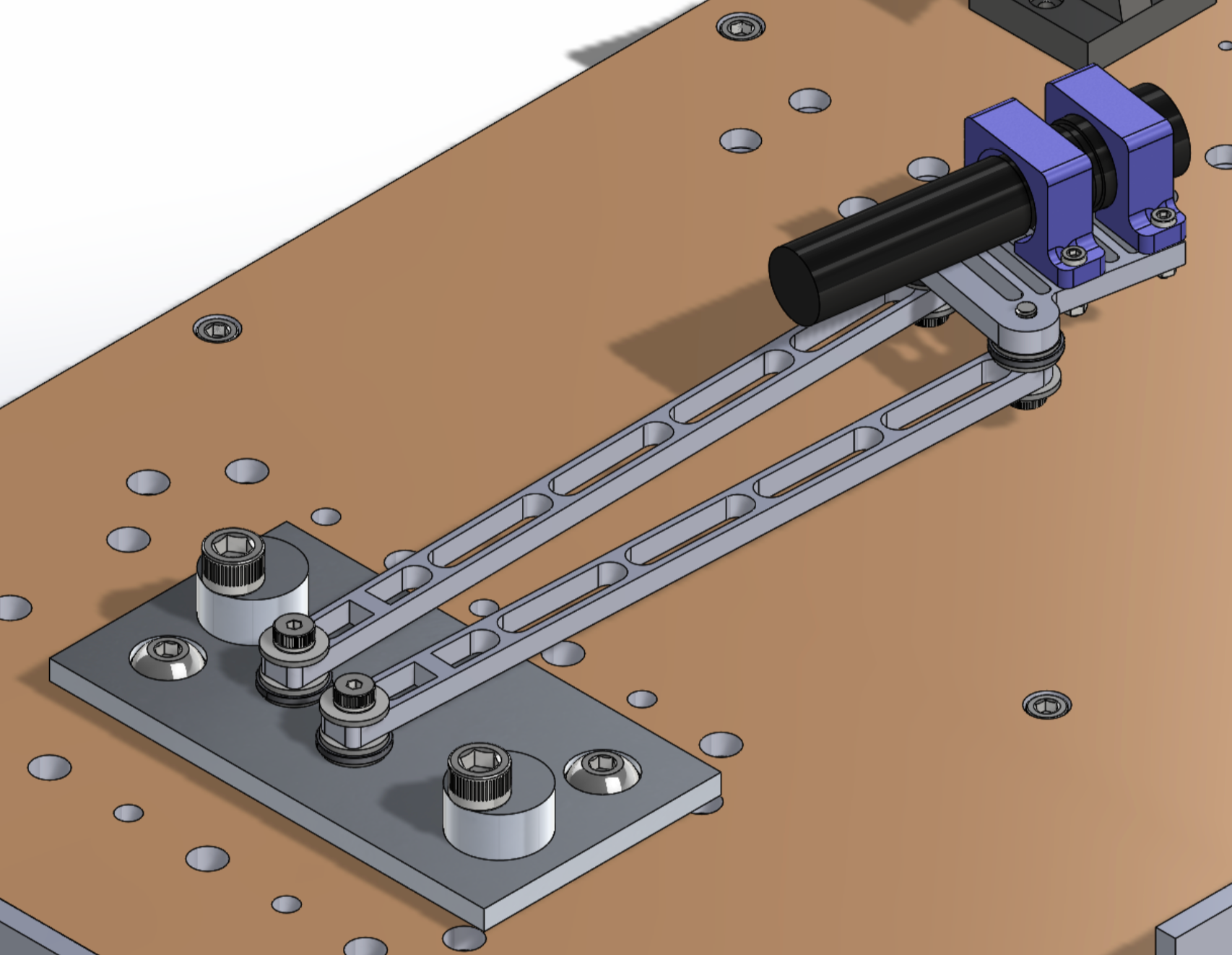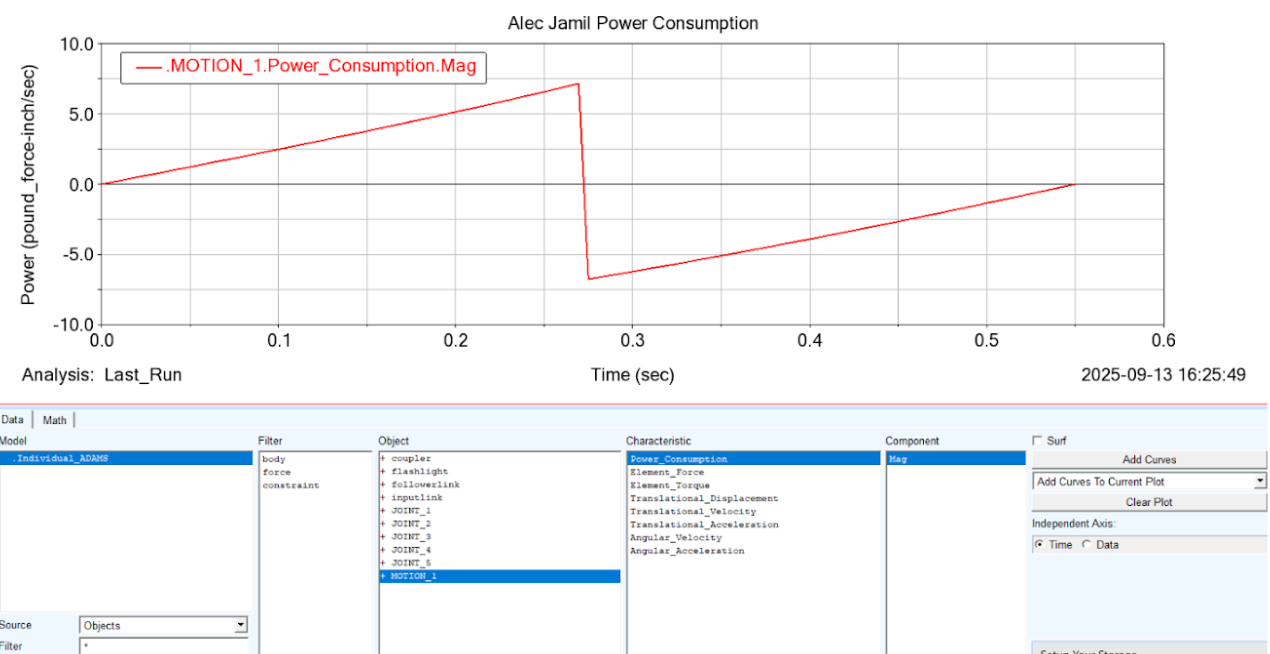 Adams was used to determine the linkage's power consumption, and coupling this data with each linkage's transmission angle, a final linkage design was chosen and modeled in Solidworks, using joint stackups that would minimize friction while maintaining rigidity: