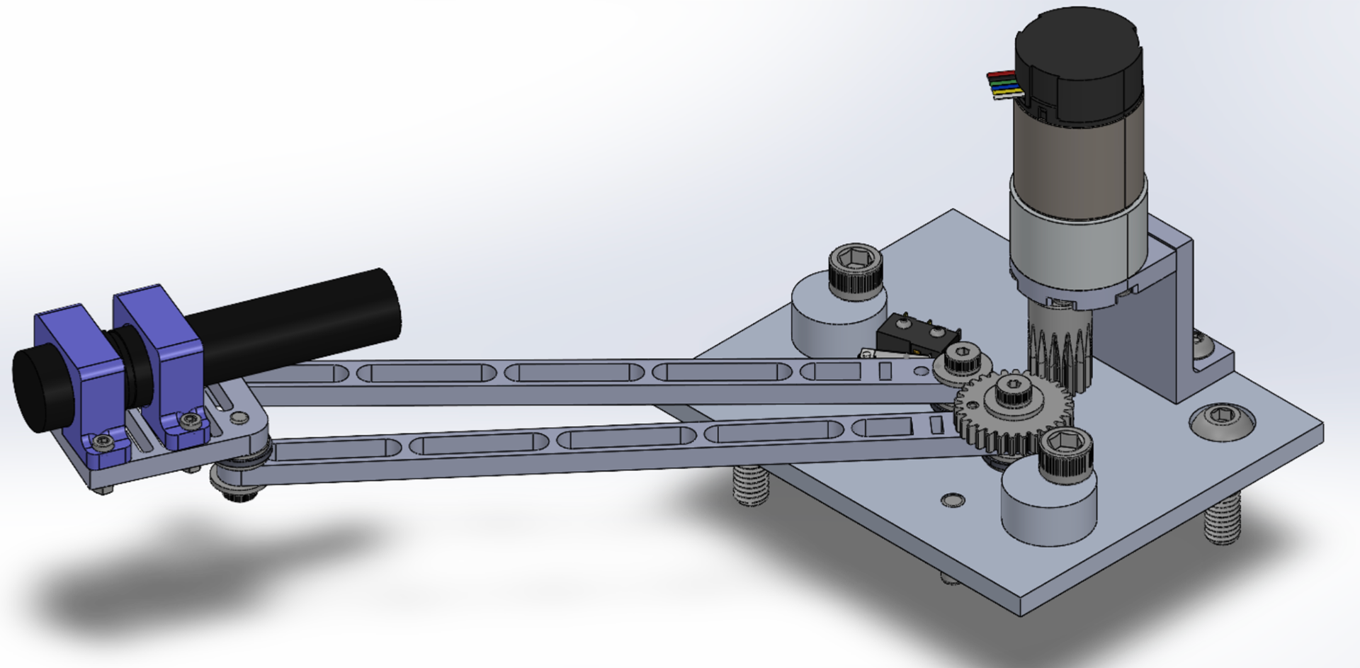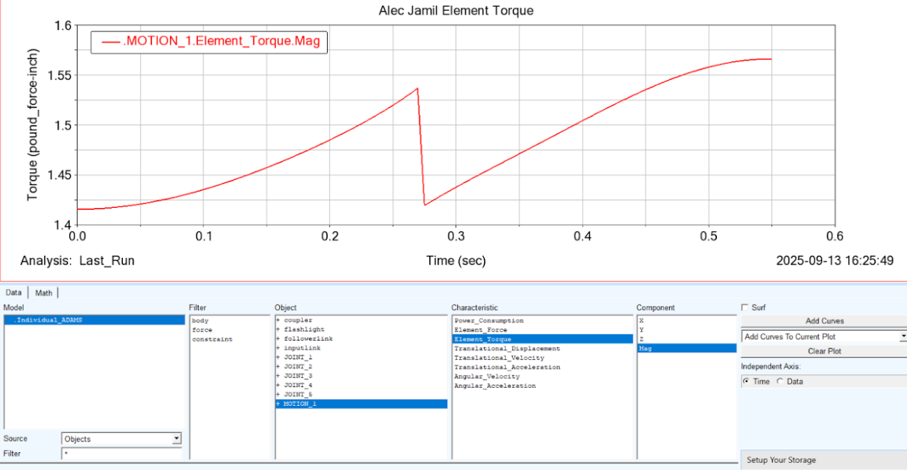 For Design and Manufacturing II (ME 350), my team was tasked with designing and building a linkage driven by a DC motor to work with a closed-loop PID control based on encoder readings and move through specific positions. The design process began by sketching a linkage on Solidworks that would move through a range of 4 desired positions while maintaining a transmission angle close to 90degrees. After developing a rough sketch, a rough 3D model of 5 designs was created and imported into Adams (a dynamic simulation software).